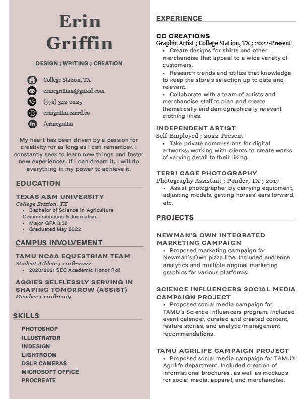 During my education and work experience, I've designed visual brand campaigns, apparel, and marketing materials from scratch. Utilizing my skills, I created copy and taglines, edited advertisements, made mockups, and more.To view more of my works, click the links below.CC Creations WorkNewman's Own Class CampaignTate's Bake Shop Class CampaignShield Masking Solutions LogoImport 2020 Business CardTAMU Animal Science Informational Brochure Project